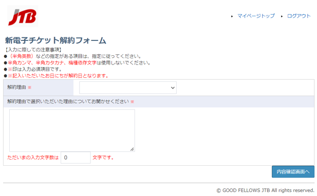 新電子チケット解約フォームより解約理由選択(選択必須)と自由記載(入力必須)をご入力ください。