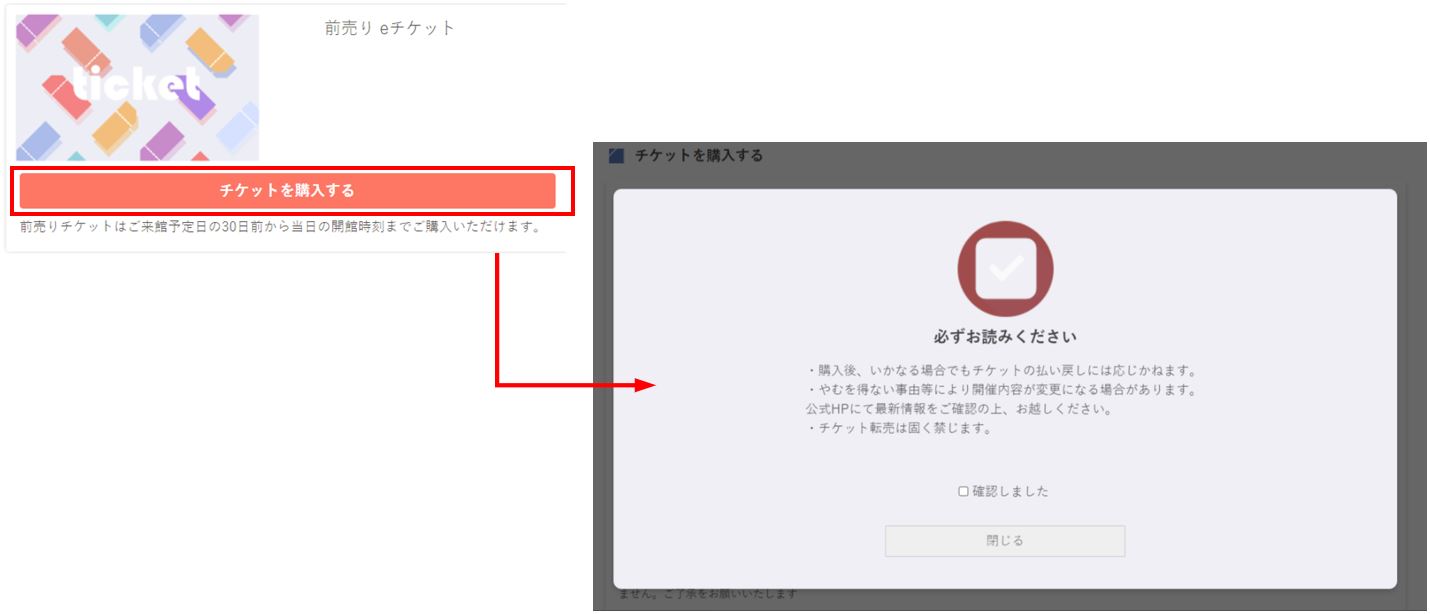 ・「チケットを購入する」を押下後にポップアップが表示され、ゲストに必ず確認いただけます