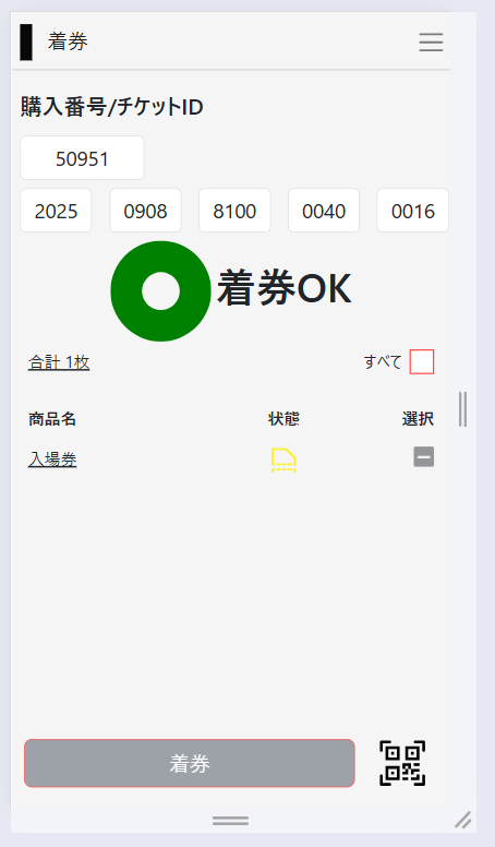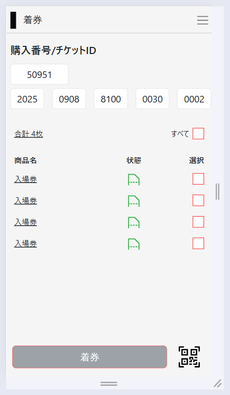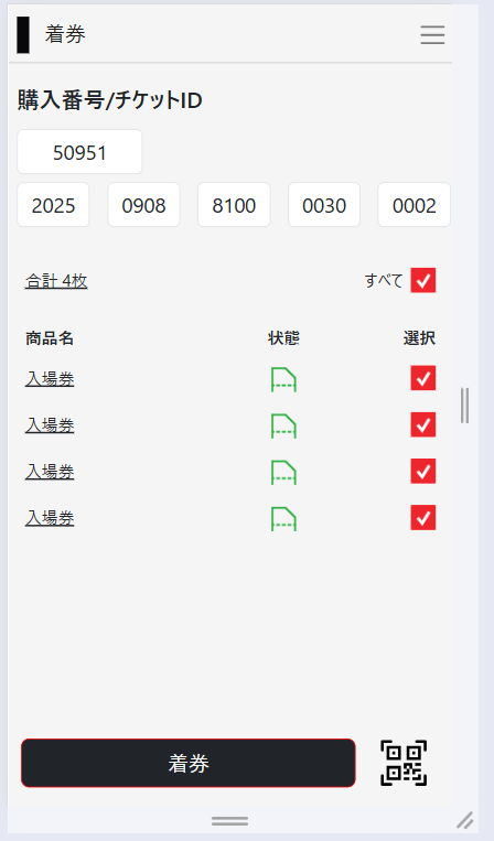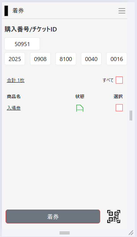 ※「すべて選択」チェックボックスより、複数チケットを一括着券も可能です