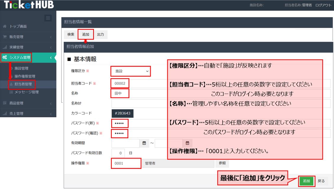 TicketHUB管理サイト【システム管理 > 担当者管理】から追加します